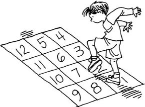 Players can scratch a course in the dirt with a stick or draw it on a concrete surface with chalk. Now you can play hopscotch. Hop through the squares skipping the one you have your stone in. You need very little to play hopscotch. Players take turns, standing in a line at the start/finish line.